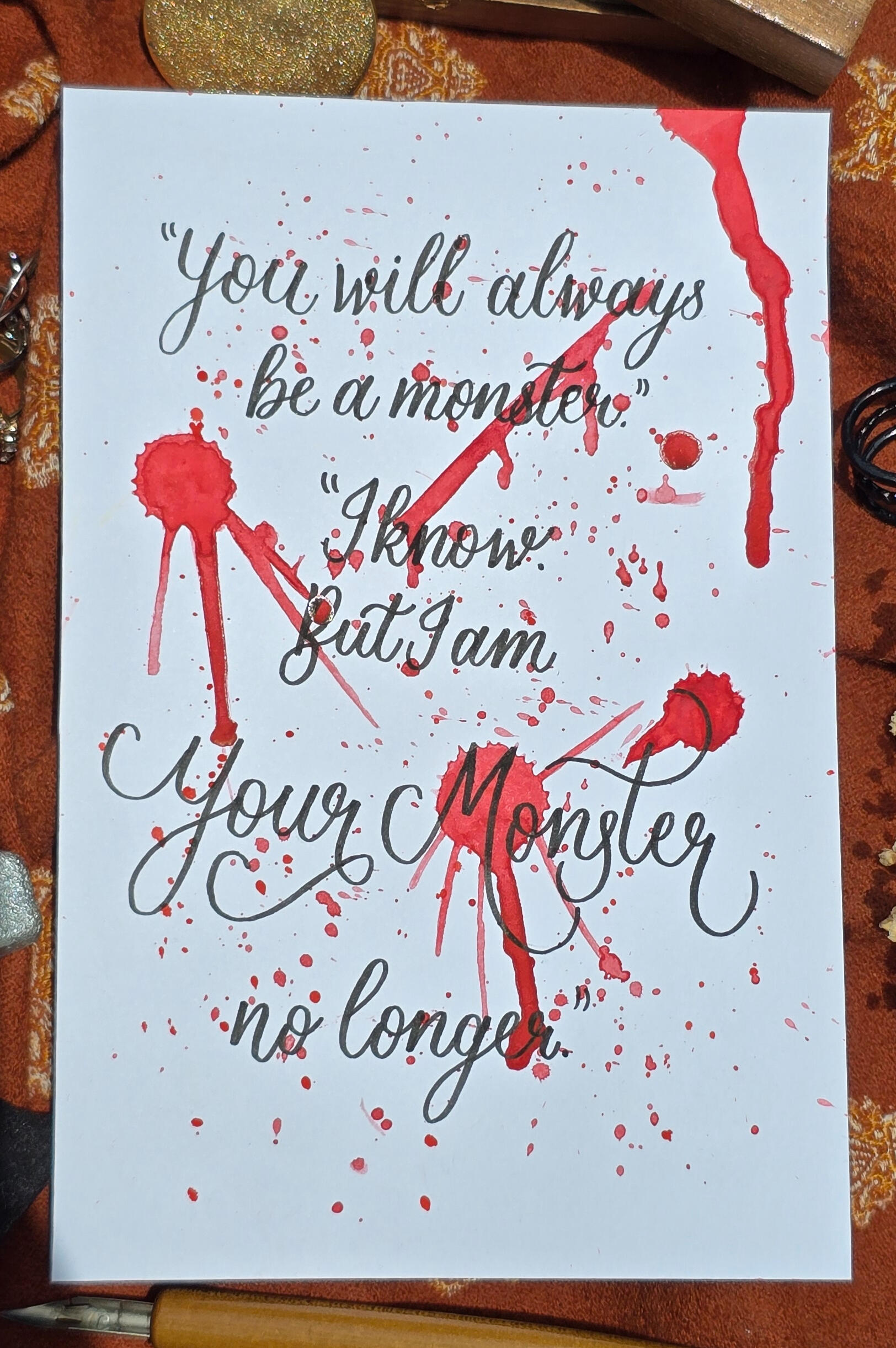 Some of my favourite moments from the God of War franchise, commemorated through calligraphy. Techniques used include brush pen calligraphy, pointed pen calligraphy, faux calligraphy and watercolours.