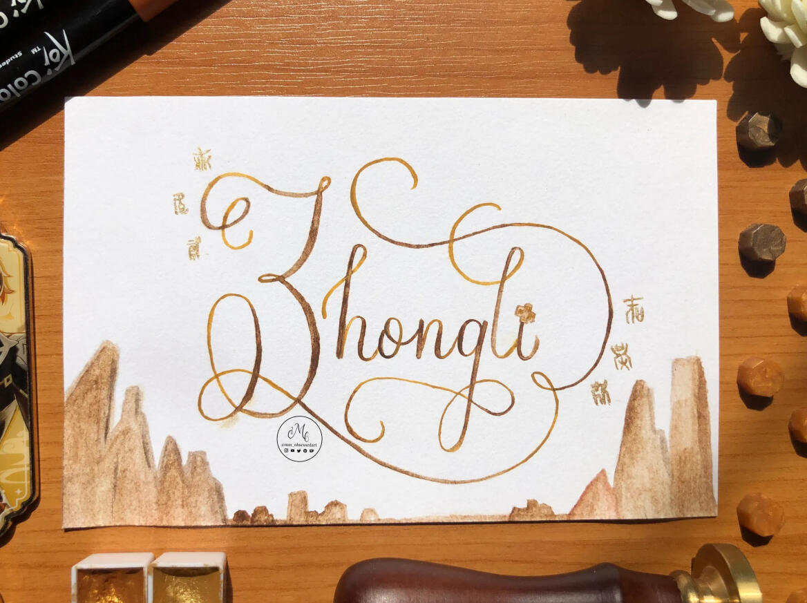 My favourite characters from the game Genshin Impact. From the calligraphy itself to the decorative elements, this series was entirely done using watercolours only.